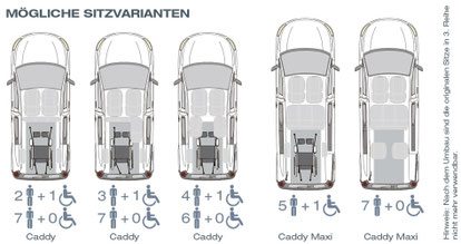 HINWEIS: Nach dem Umbau ist die werkseitige Lösung als 7-Sitzer nicht mehr möglich; Ab sofort ist auch der Volkswagen Caddy Maxi mit Hybridantrieb als rollstuhlgerechtes
